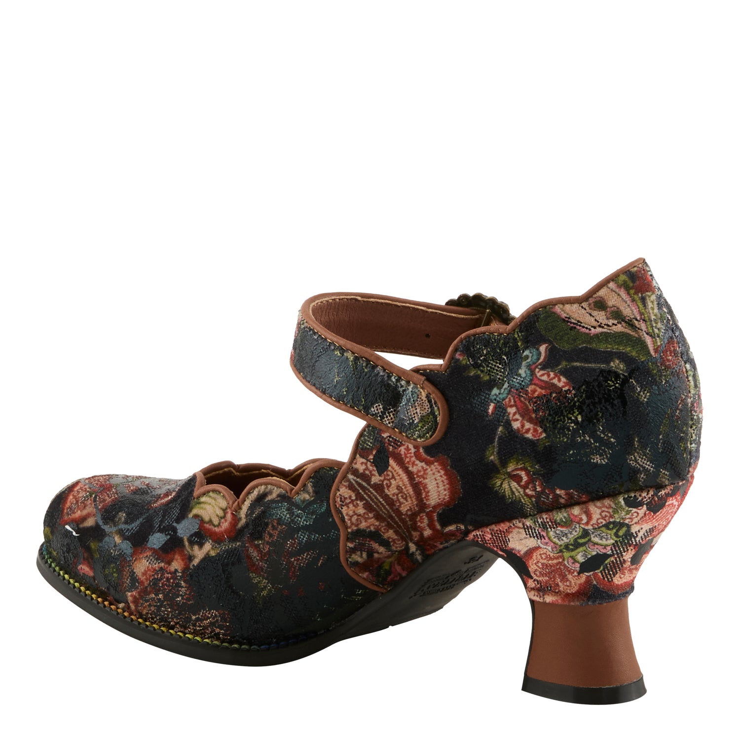 Indulge in vintage-inspired elegance with this stunning baroque-style Mary Jane. Crafted with a luxurious velvet and leather combo upper, this shoe features an artistic blend of colors, textures, and scalloped edges for a truly unique look. The ornate, antique-style buckle complements the adjustable hook-and-loop closure, offering both style and convenience. A modest, sculpted heel provides a graceful lift while ensuring comfort throughout the day. Perfect for adding a whimsical yet sophisticated touch to any outfit, this shoe is a wearable piece of art designed for the modern, trend-forward woman.