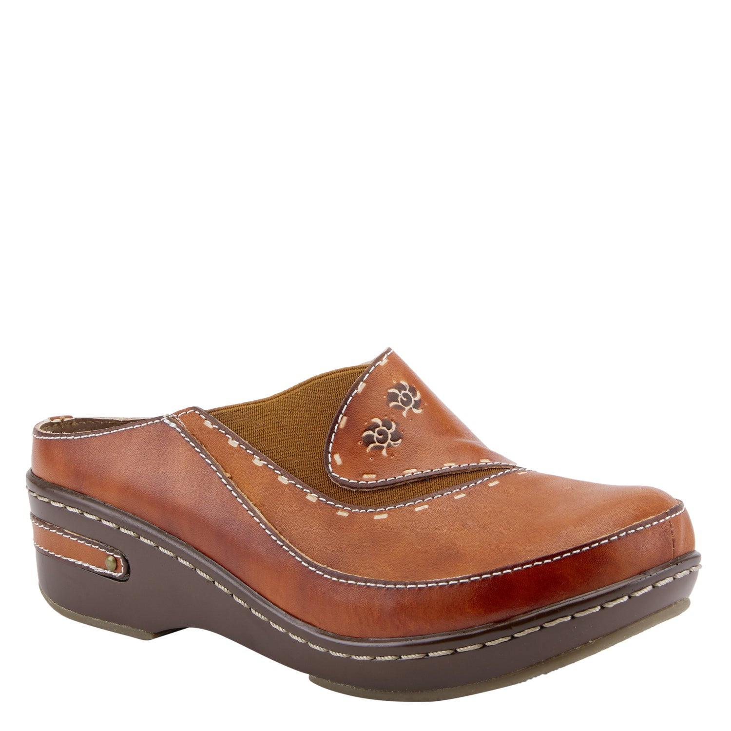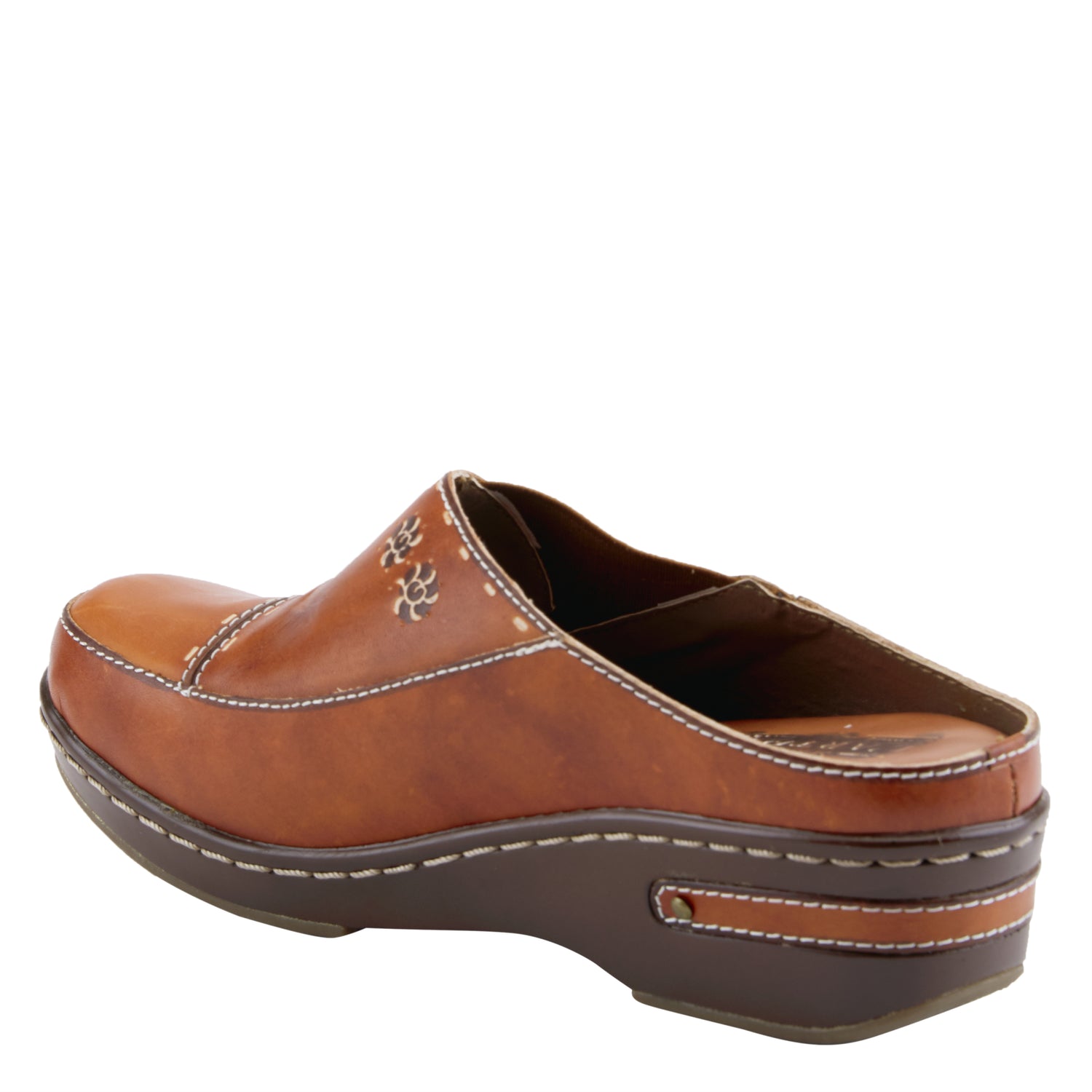 Hand painted, open-back, leather clog with elastic piecing and contrast embossed design.