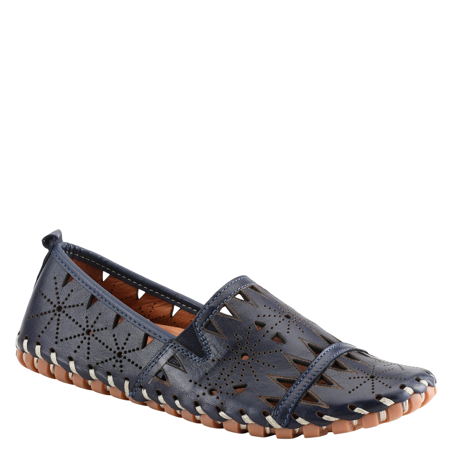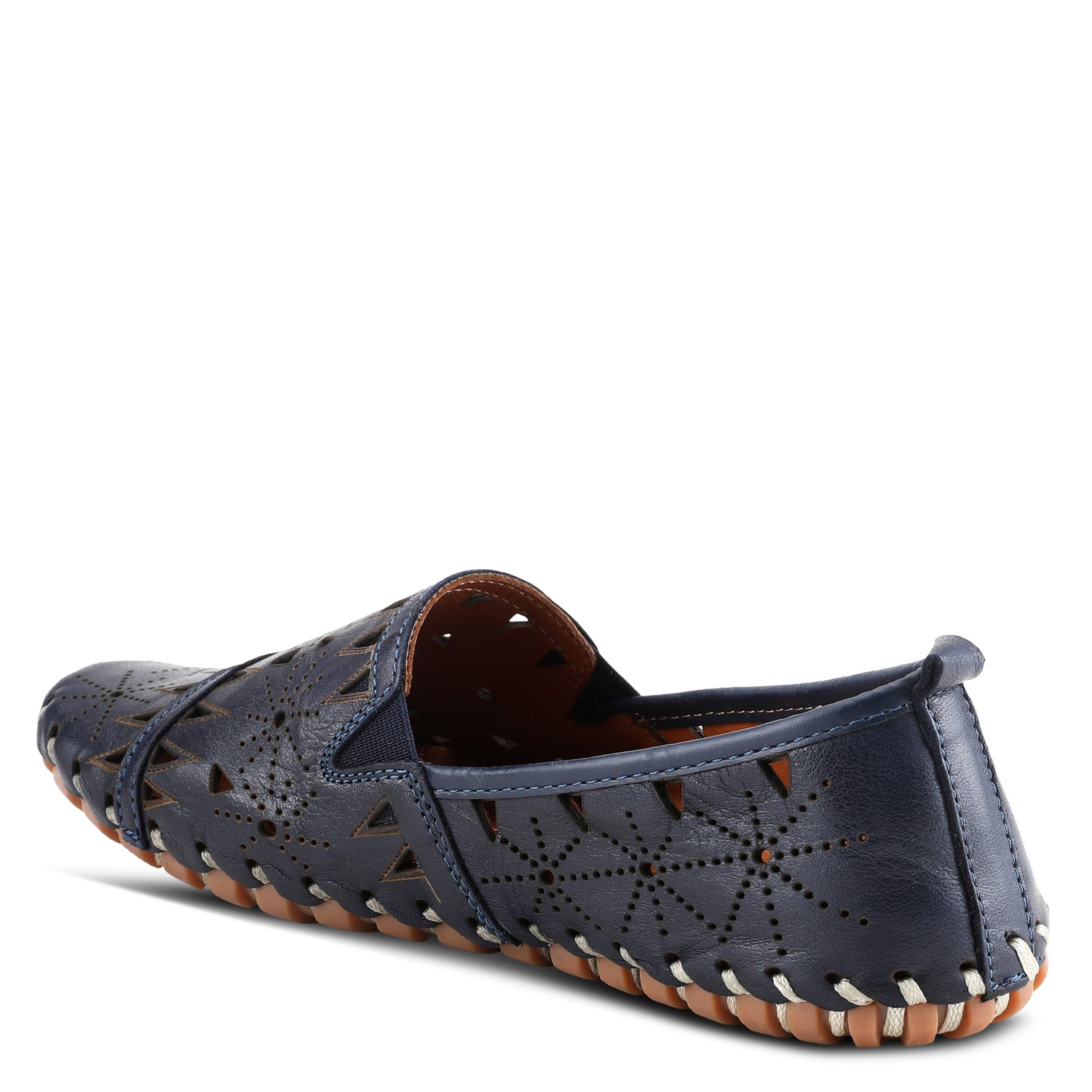 European influenced, leather slip-on loafer, featuring geometric laser cutouts and etching with incorporated stretch elastic goring all on a lightweight, flexible, rubber outsole.