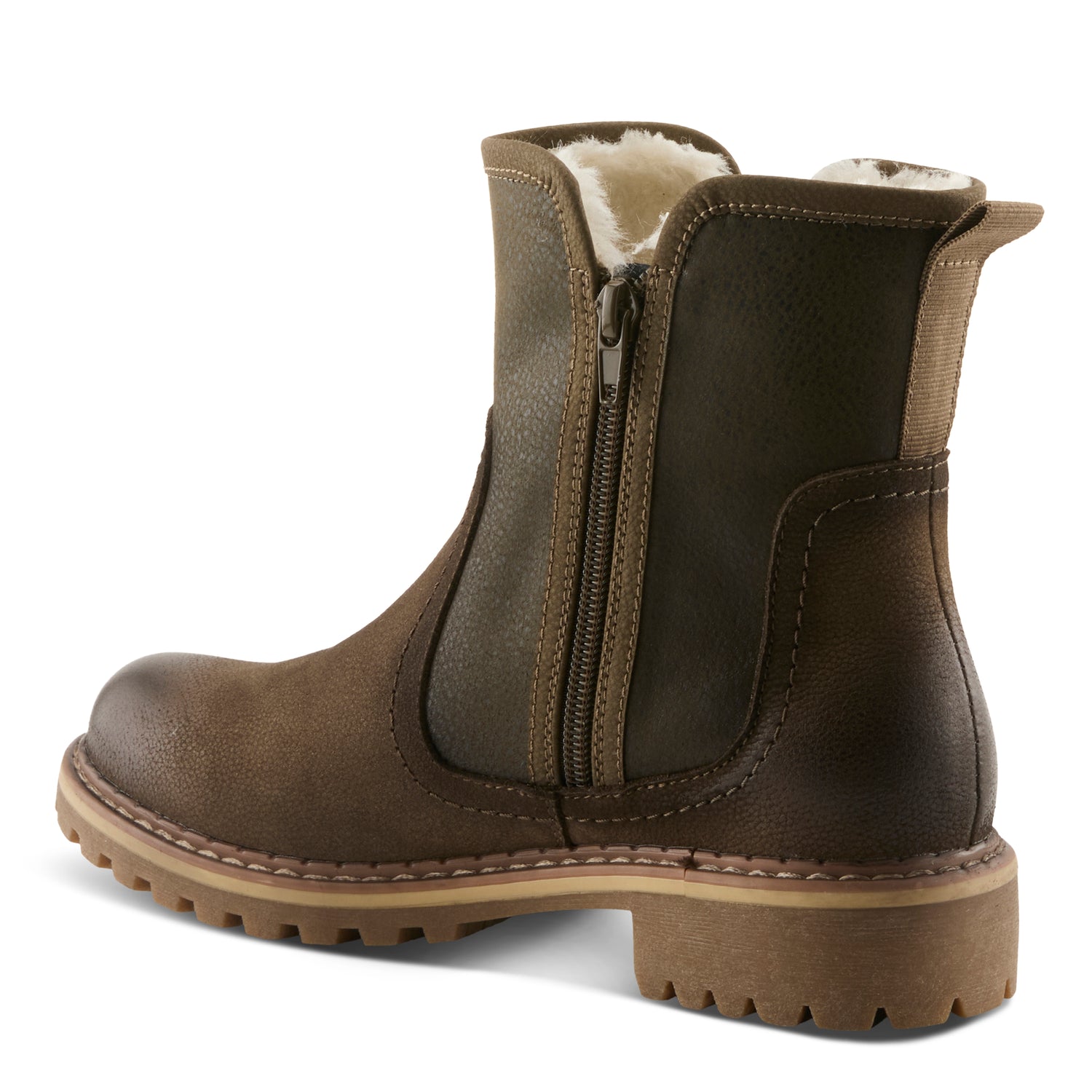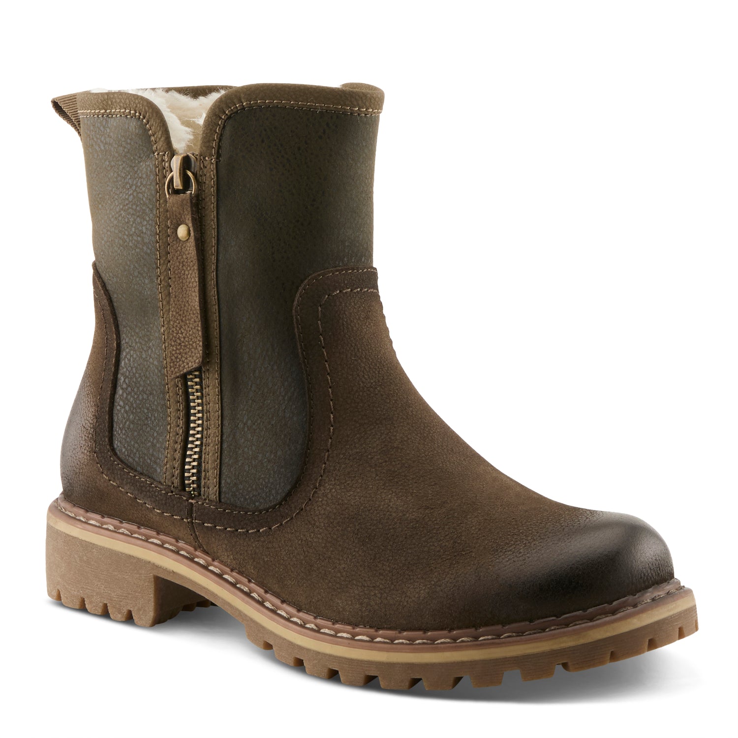 Stay stylish and cozy with a rugged yet refined leather combo bootie designed for versatility and comfort. Featuring double functional zippers, this bootie allows for easy on-and-off wear while adding a bold touch to its design. The faux fur lining provides warmth and softness, making it perfect for chilly days. Tonal stitching enhances the rich leather texture, while the contrast stitching on the welt adds a handcrafted appeal. Finished with a durable lug sole, this bootie offers superior traction and stability, making it an effortlessly chic and practical choice for everyday adventures.