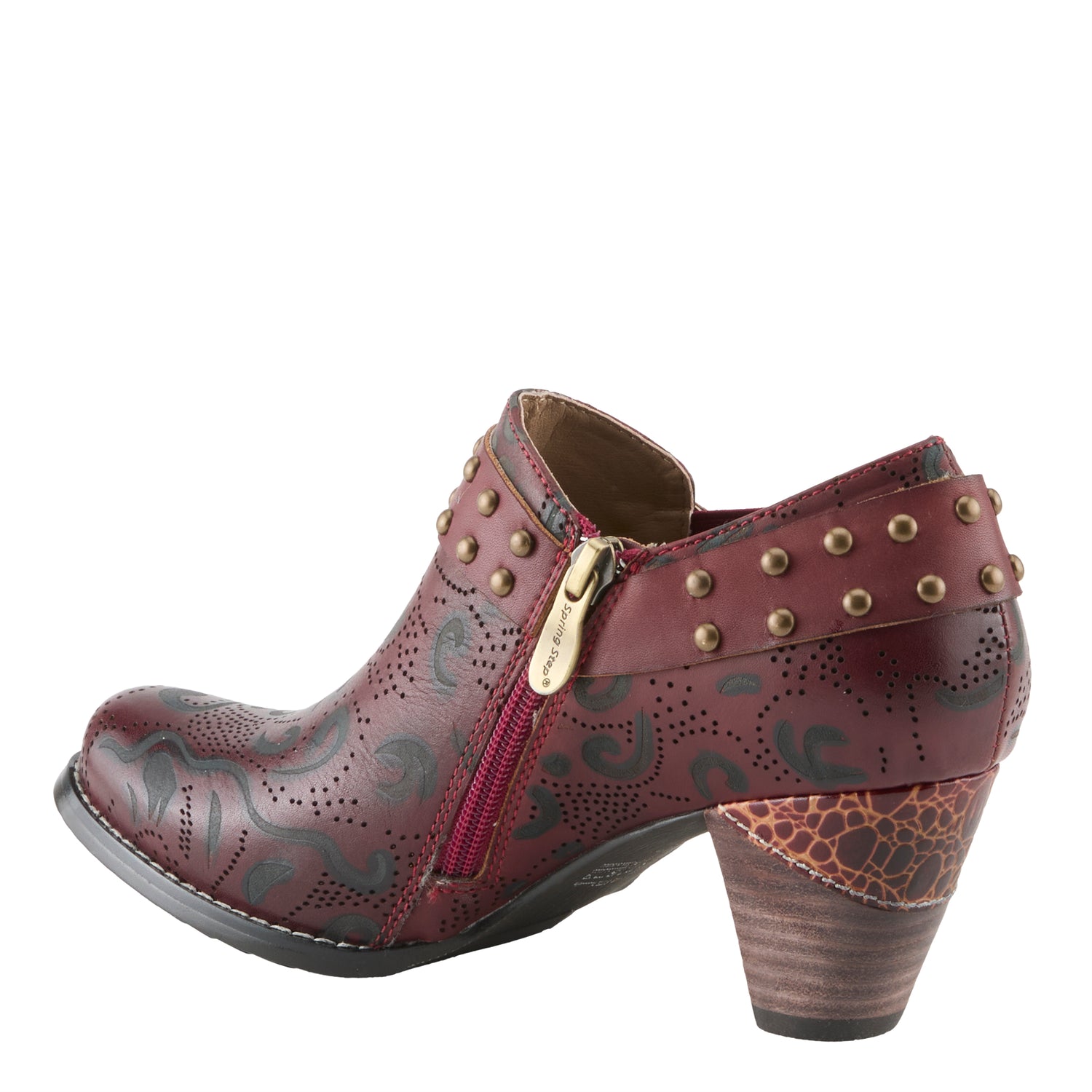 Western-inspired shootie in beautiful hand-painted burnished and tooled leather detailed with decorative riding style studded ankle strap, wide outside elastic goring and inside zipper for easy on/off on a stacked inlay cone heel.