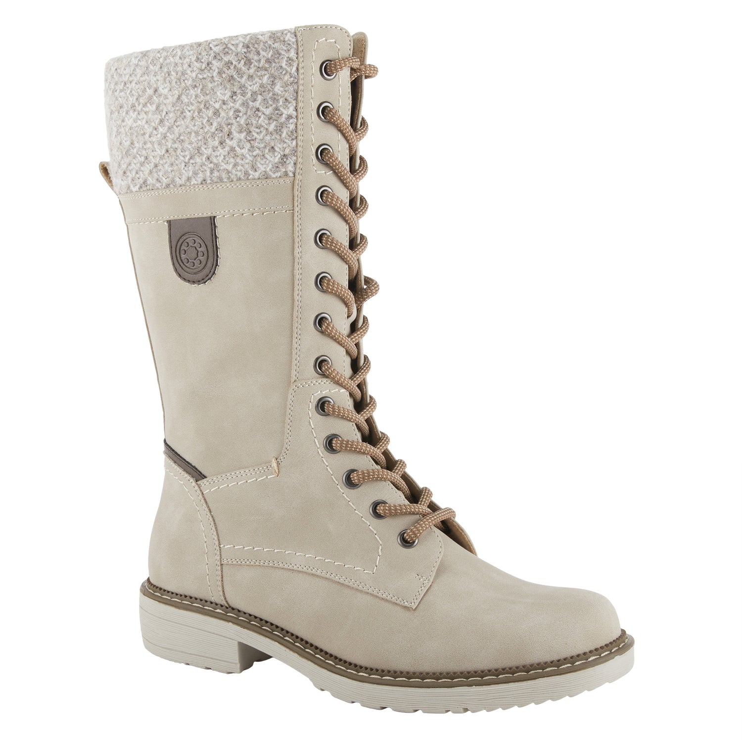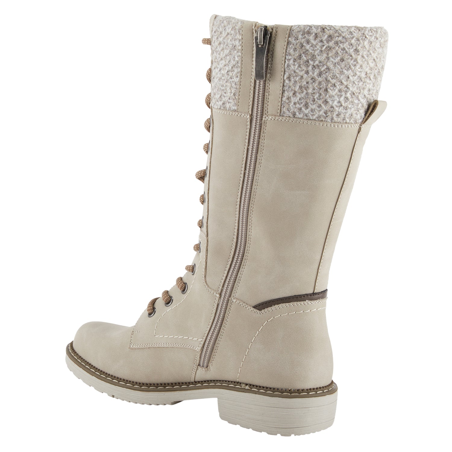 Your new favorite winter boot that provides warmth and comfort all day long. Easy on and off with inside zipper and adjustability through front laces. Thoughtfully constructed on a stable outsole and beautifully detailed with a sweater trim.